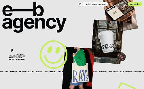 Damn, don't you just love this agency website? Literally, from the preloader to the subtle sticker overlays, the images at an angle, on scroll animations, you've got these kind of hand-drawn elements, but then a really kind of direct feel with the website. I love the bold fonts, capitalized, and then you've also got a ton of imagery that gives it such a playful, colorful feel. And it has the space to be colorful because obviously you've got so many subdued sections color-wise, which gives it the pop of color when you're looking at the work. I mean, bosh, so tasty.