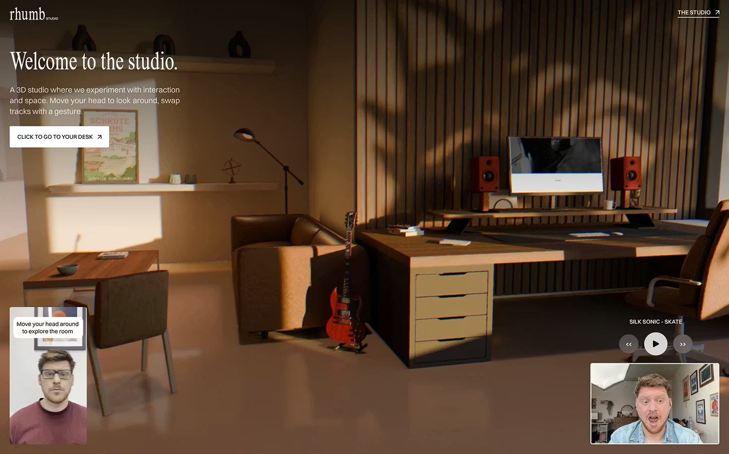 So we created an interactive 3D website that lets you step inside a virtual Rhumb Studio. Think exposed wood, art on the walls, great sound system, and a space you can actually look around using your head — not just your mouse.